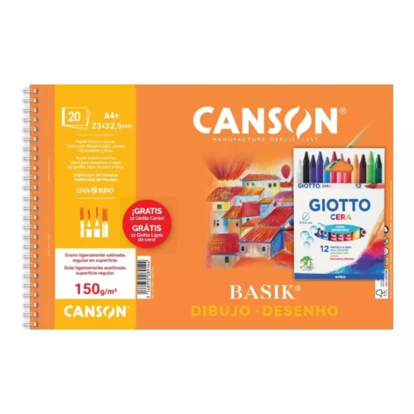 Bloc Dibujo Basik Espiral Liso Canson a-4 contiene 20 hojas de 150g + 12 Ceras Giotto