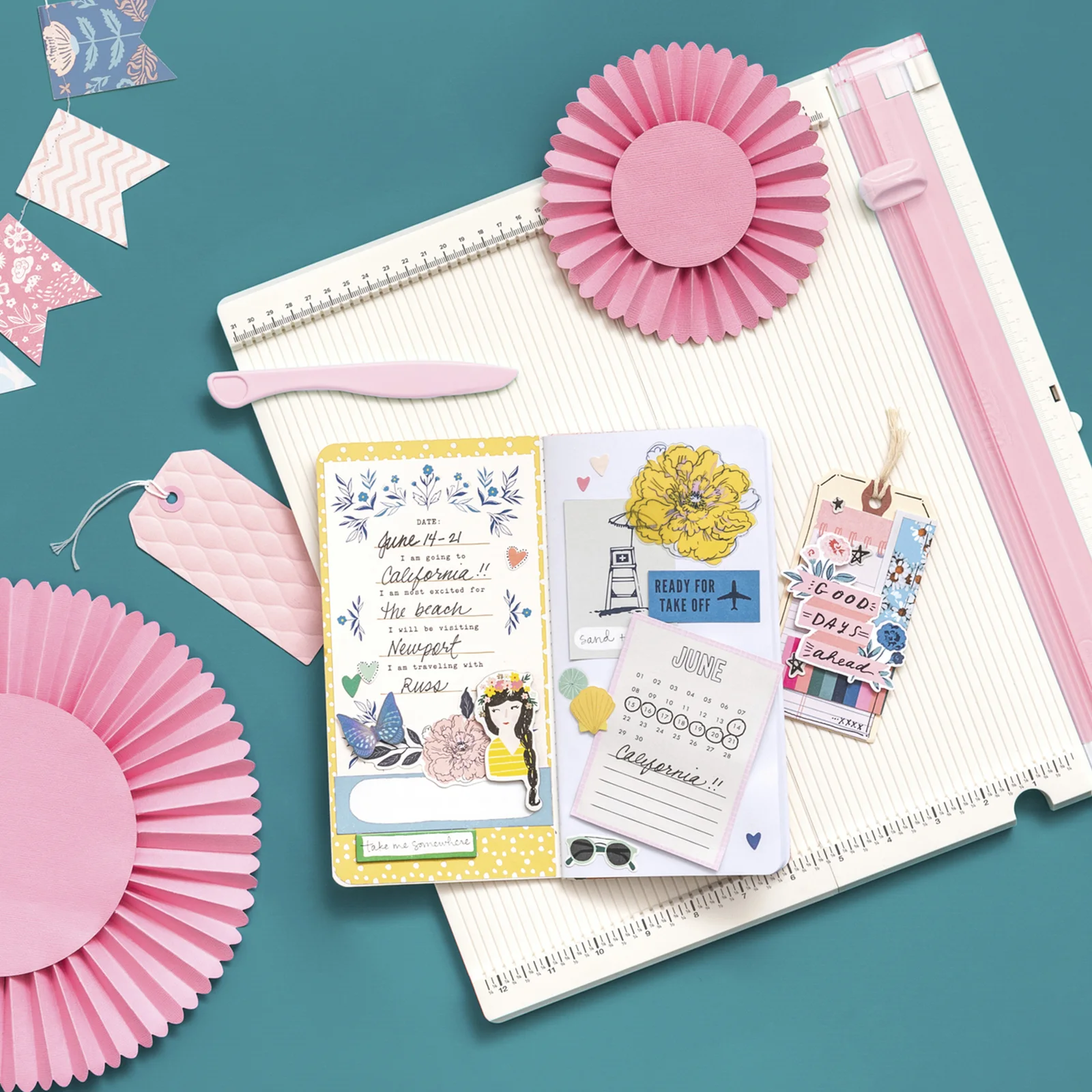Dobla y corta fácilmente tu papel con esta herramienta de We R Makers. Las dimensiones indicadas en la máquina de corte son tanto en CM como en pulgadas. Despliegue la extensión de la regla para medir hasta 30.5 cm de la línea de corte.