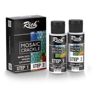 Craquelador BLANCO de color de dos pasos al agua, ideal para crear efecto de porcelana rajada o un efecto de grieta “cocodrilo” envejecido. El efecto de crujido se puede controlar por el espesor de aplicación. Para craquelados más grandes se recomienda la aplicación de dos capas. Se recomienda utilizar el pincel de forma horizontal. Aplique una capa de capa base (Paso 1) uniformemente a la superficie y deje secar (se seca cuando se vuelve transparente) aplique una capa del Paso 2 de manera uniforme. Se puede proteger con con Barniz Cadence Spray.