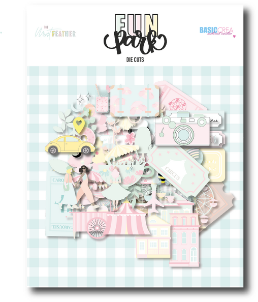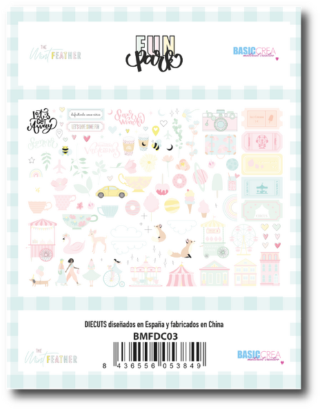 Paquete que contiene 118 die cuts, formas recortadas a color en cartulina,de la colección Fun Park The Mint Feather de Adela Silvestre.