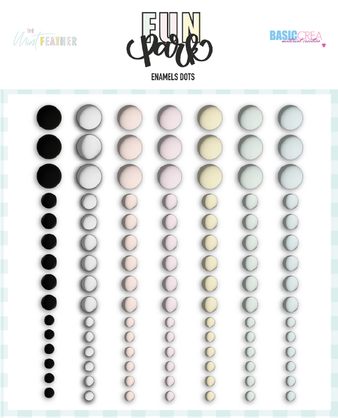 Paquete que contiene enamel dots de 7 colores distintos medida de 1cm a 3 mm,de la colección Fun Park The Mint Feather de Adela Silvestre.