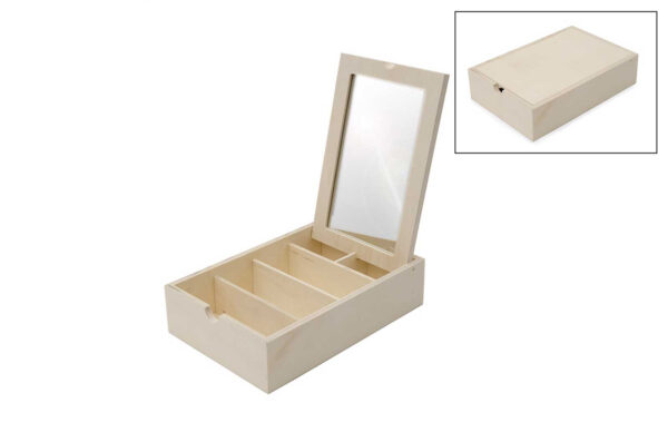 Joyero con tapa. Al abrir la tapa tiene un espejo en la parte trasera. Por dentro hay divisorias que facilitan para organizar sus joyas. Medidas: 17x25x6cm.