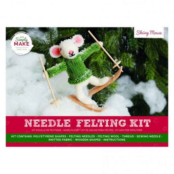 Todo lo que necesitas para hacer tu propia decoración de ratón de esquí de fieltro con aguja. Incluye mecha de lana, agujas para fieltrar, base de poliestireno, accesorios, hilo e instrucciones.