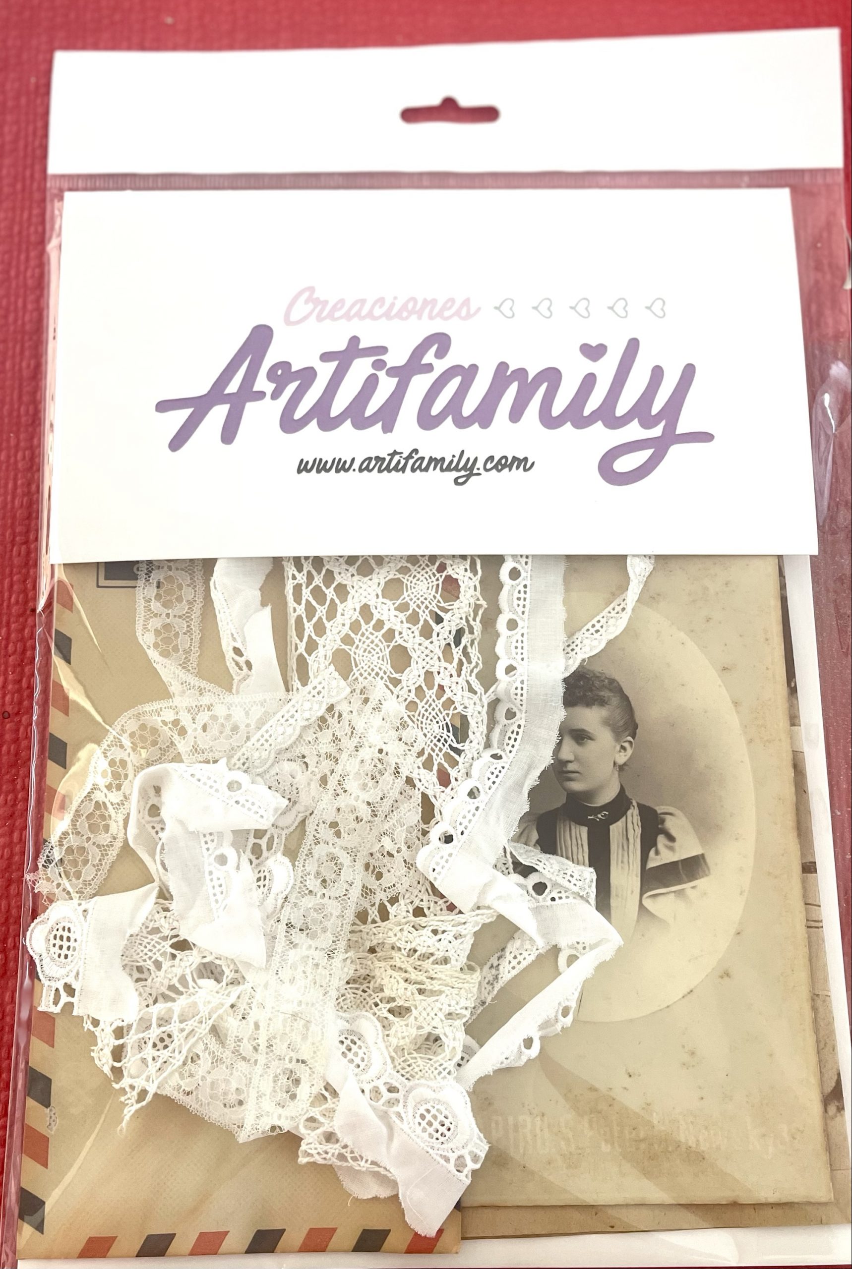 Este kit contiene 1 hoja doble de periódico del año 1945, 1 fotografía original de los años 30/40, 5 puntillas variadas , 1 sobre aéreo original