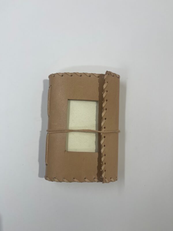 Libro Artesanal piel camellero con cierre cordón natural y ventana en la portada para ver primera hoja , su interior esta formado por hojas beige 100% algodón hecho a mano, es ideal para acuarela, journal creativo, escritura, su tamaño de bolsillo 15*10cm es ideal para llevarlo siempre en el bolsillo, para momentos de inscripción