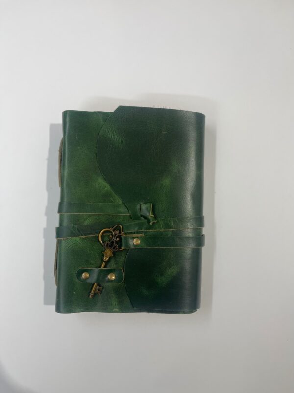 Libro Artesanal realizado con piel color verde, su interior esta formado por hojas color crema artesanales 100% algodón, su encuadernación es cosida y su cierre es con una tira del mismo tono con llave bronce, es ideal para realizar acuarela, journal creativo, escritura etc