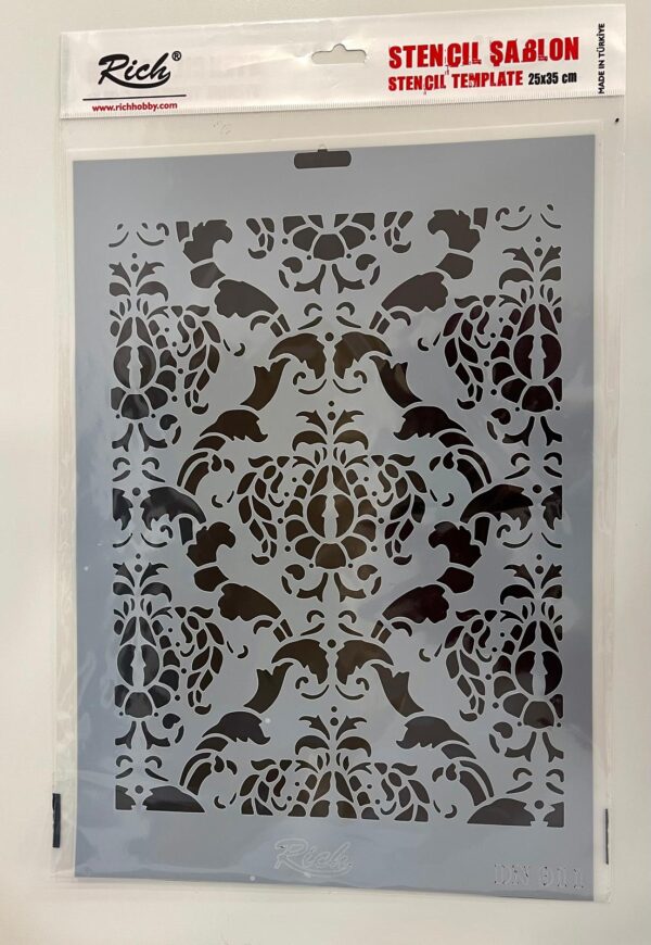Stencil diseñada para la decoración de madera y muebles. Es adecuado para su uso con todos los grupos de pinturas y pastas. No se rompe ni se rasga fácilmente. Se limpia fácilmente con agua tibia. Aplicar Rich Stencil Spray en las superficies verticales evitará resbalones y desbordes de material en sus diseños.